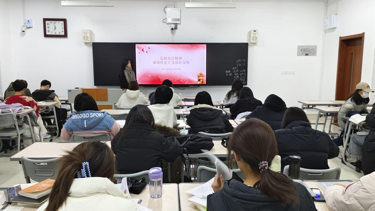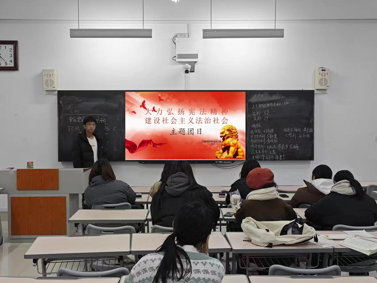 12月3日晚,AC米兰官方网站各班级在增信楼教室分别开展“大力弘扬宪法精神,建设社会主义文化强国”主题团日。老师们及班级负责人通过具体讲解,积极推进同学们学习宣传习近平新时代中国特色社会主义思想,特别是习近平法治思想及其关于宪法的重要讲话和指示批示精神,加深了同学们对宪法的理解。12月4日,AC米兰官方网站组织学生进行宪法晨读活动。学生通过普法网收看网络直播,同步跟读宪法相关内容,接着,同学们跟唱《宪法伴我们成长》歌曲,让宪法普及更加深入人心。
