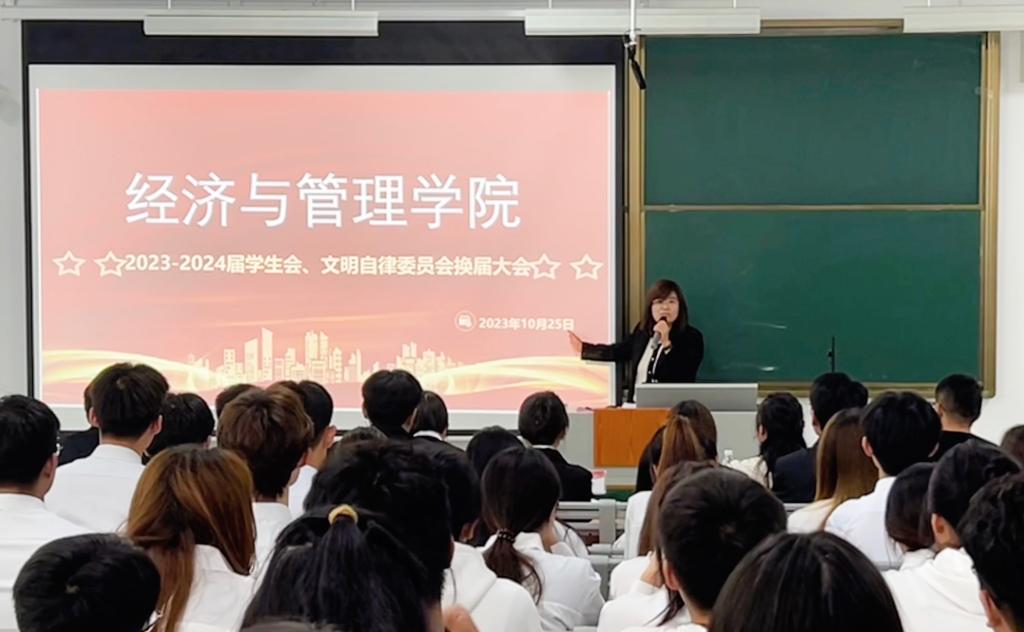 大会伊始,张璇宣读2023-2024届学生会、文明自律委员会主席团及部长名单,并由新任学生会主席王铭坤为其颁发聘书。紧接着,2022-2023届院学生会主席田长丰将学院院旗传递给新任主席并进行发言。随后,新任主席为新任部长一一颁发聘书并发言。最后,谢金萍发言,她对上一届学生会的工作给予充分肯定,并对新一届当选的学生干部表达了真诚的祝贺。谢金萍结合当前学院发展的实际情况,对学生干部提出四点要求和希望:一是以身作则,创新工作模式;二是注重自身品德修养和道德建设,胸怀赤诚之心;三是对自己的职位有正确的定位,树立服务意识;四是具有强烈的集体荣誉感、责任感和团队精神。