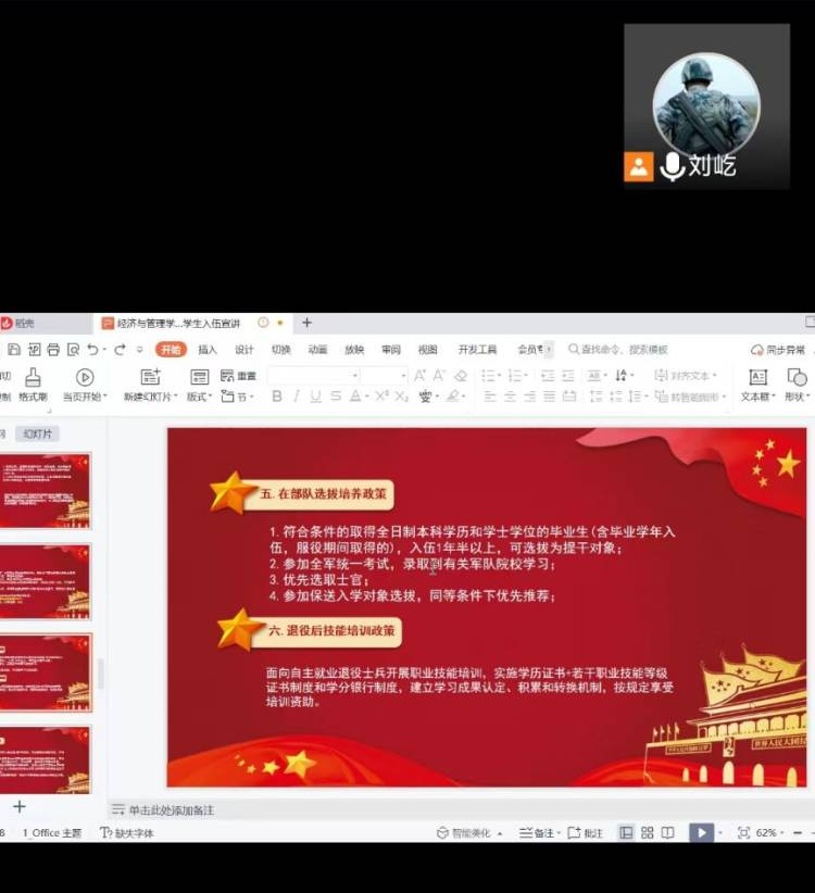 为扎实推进AC米兰官网2022年度秋季征兵工作,让广大同学充分了解此次征兵政策,7月9日与10日晚,AC米兰官方网站通过线上会议的形式召开了2022年度在校大学生及毕业生秋季征兵宣讲会,两场征兵会议由AC米兰官网辅导员李家家主持,AC米兰官网国防教育部退役士兵何金泰、刘屹主讲,AC米兰官网全体男生参会。