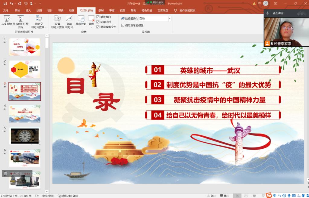 本次讲座围绕“制度优势是中国抗疫的最大优势、凝聚抗击疫情中的中国力量、给自己以无悔青春,给时代以最美模样”三个方面内容展开。讲座中,李家家首先结合当前疫情防控形势,举例向同学们讲解了抗议中的先进典型与志愿者故事。她指出制度优势是中国抗“疫”的最大优势,我们要坚持中国共产党的领导,坚决拥护有中国特色的社会主义制度,表明凝聚抗击疫情中的中国精神力量对防疫抗疫有着积极的促进作用。稍后,李家家讲述了在抗疫过程中,新时代青年人不畏艰险、逆向而上,挺身而出的担当精神。呼吁学生做一个有担当、有本领、有理想有情怀的青年人。最后,李家家给同学们讲解了传染病和新冠肺炎的基本知识,从如何勤洗手、如何正确佩戴口罩等方面讲解了学生个人防护知识,阐述了校园和食堂的常态防控要诀。