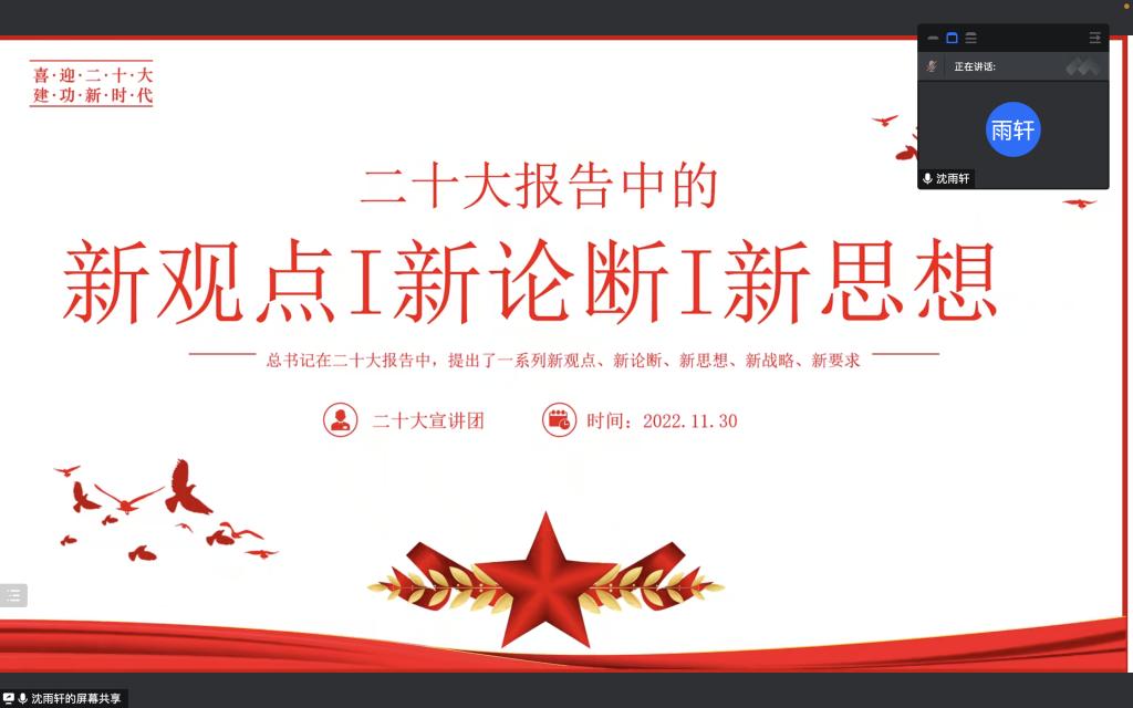 11月30日,由学生会部长组成的宣讲团采用线上线下相结合的方式,以“理论阐释+形势政策教育+故事分享”的方式走进课堂,向2022级班级宣讲了二十大精神。