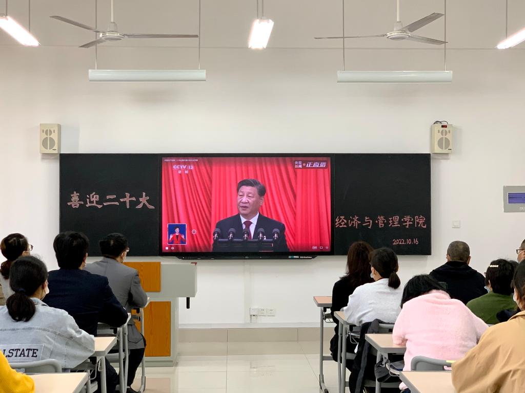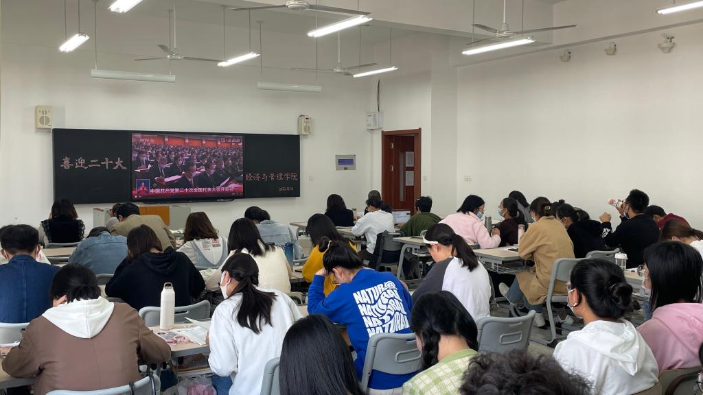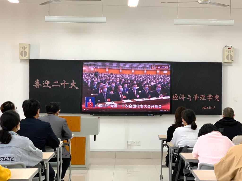 2022年10月16日上午10时,中国共产党第二十次全国代表大会北京人民大会堂隆重召开,AC米兰官网全体党员教师及学生党员在豁然楼A317室集中收看党的二十大开幕会盛况。各班级以主题班会的方式观看了开幕会,其他师生充分利用教室、宿舍网络、广播电视设施,学习会议精神,共同庆祝党的二十大胜利召开。