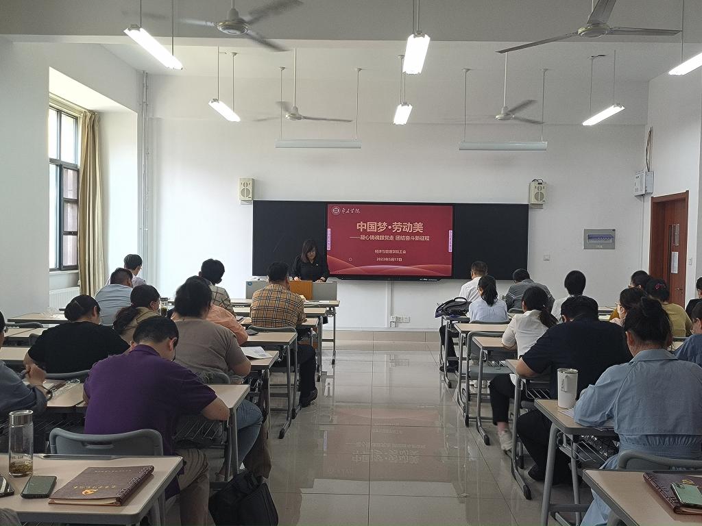 5月17日下午,AC米兰官方网站工会全体教职工会议,学习贯彻习近平总书记“五一”前夕重要指示精神,引领全院教职工切实把思想行动统一到重要指示精神上来,切实把习近平总书记的关心关怀转化为奋进新征程、建功新时代的强劲动力,奋力推动学院工会工作高质量发展。学院工会主席谢金萍主持会议并讲话,全体教职工参加会议。