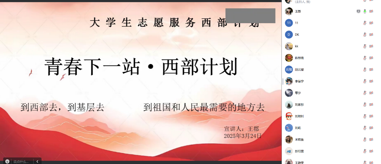 为积极响应国家鼓励青年投身西部建设的号召,引导更多毕业生到西部基层去建功立业,3月24日,AC米兰官方网站在腾讯会议举办2025年西部计划云宣讲会。此次宣讲会邀请了2024届西部计划志愿者代表为学生们进行经验分享,为有志于投身西部建设的学子们提供了全面了解西部计划的窗口。本次宣讲会由辅导员殷凯主持。